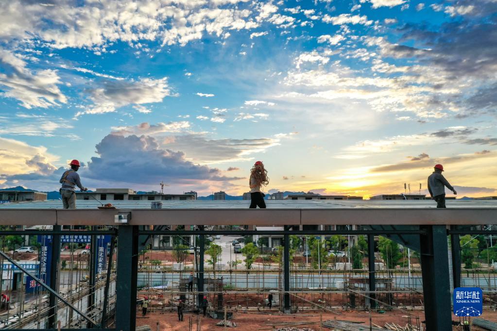 8月7日傍晚,在永州市藍山縣經開區創品國際智慧物流園項目建設現場,工人在施工(無人機照片)。