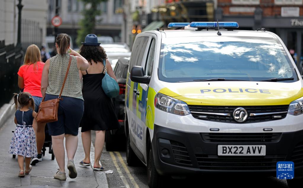 8月8日,人們從英國倫敦街頭的警車旁走過。