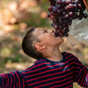 小朋友在東風農場的葡萄架下吃葡萄(8月8日攝)。