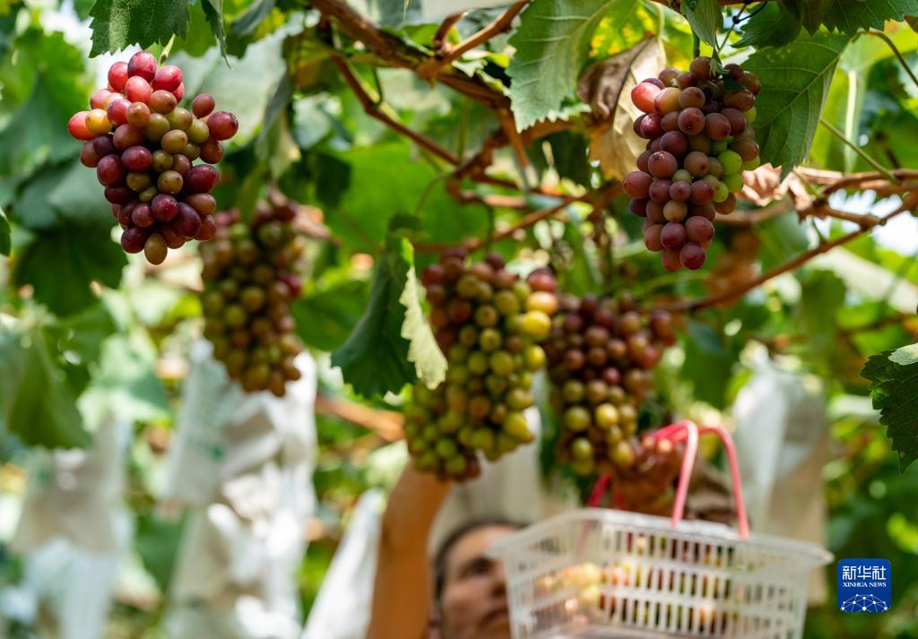 農戶在彌勒市東風農場的葡萄地里采收葡萄(8月8日攝)。 新華社記者 江文耀 攝
