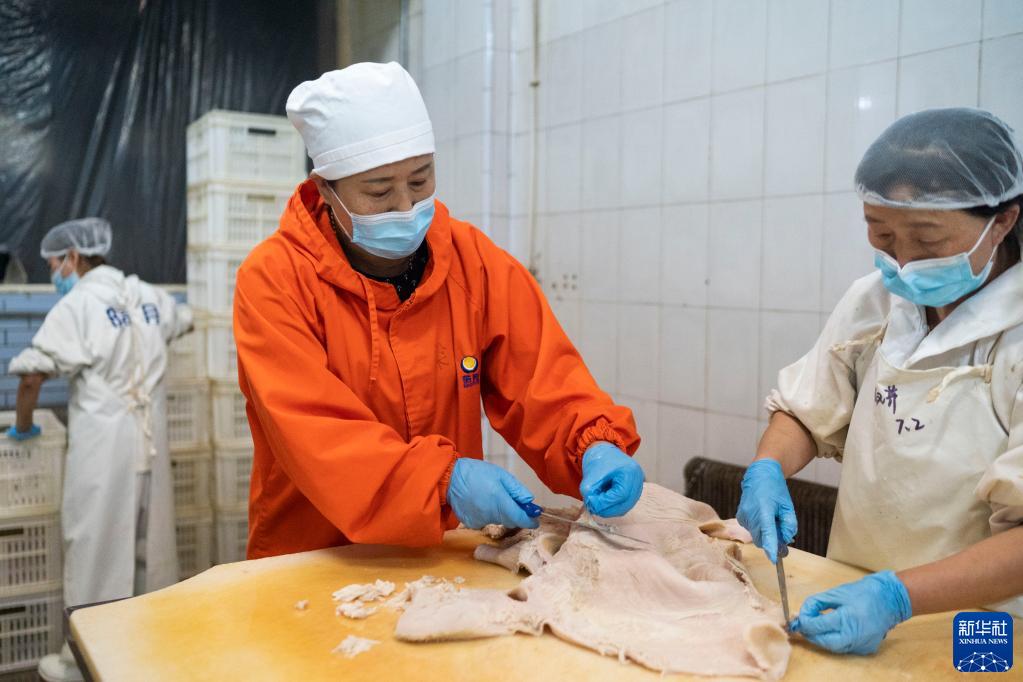 8月4日,崔玉梅(中)與同事在車間一起精修牛副產品。