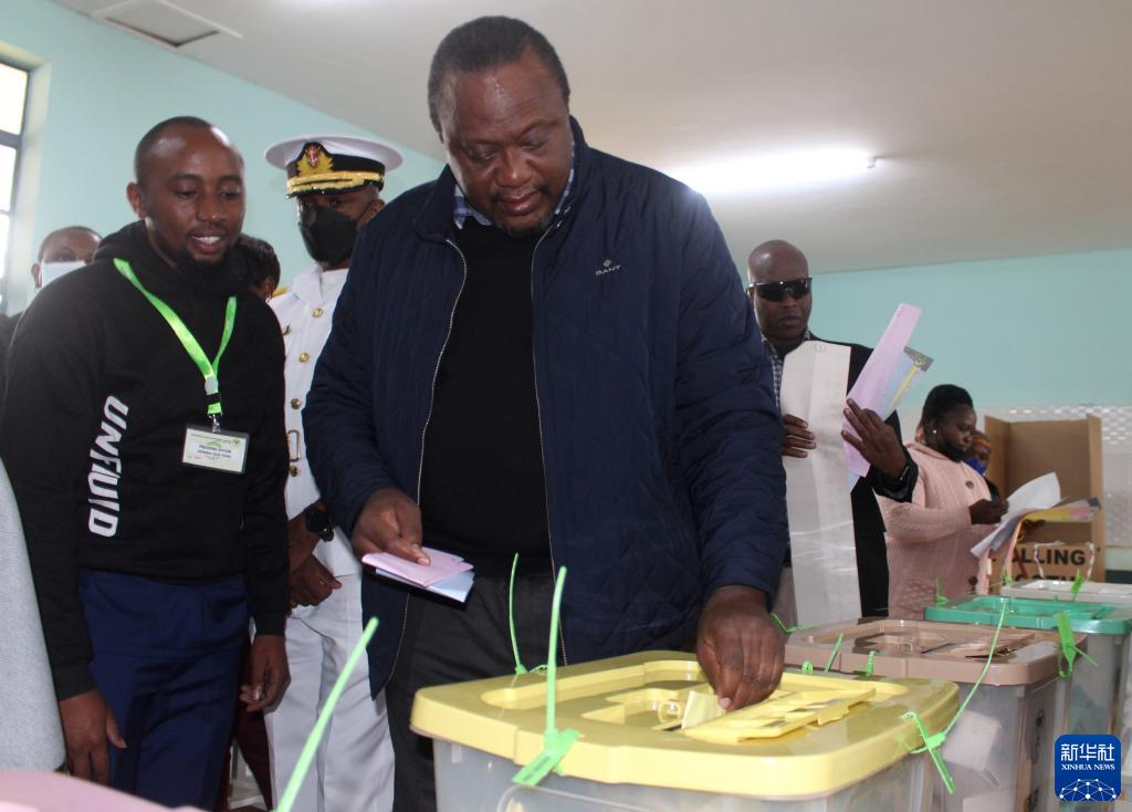 8月9日,肯尼亞總統肯雅塔(中)在基安布郡一投票站投票。