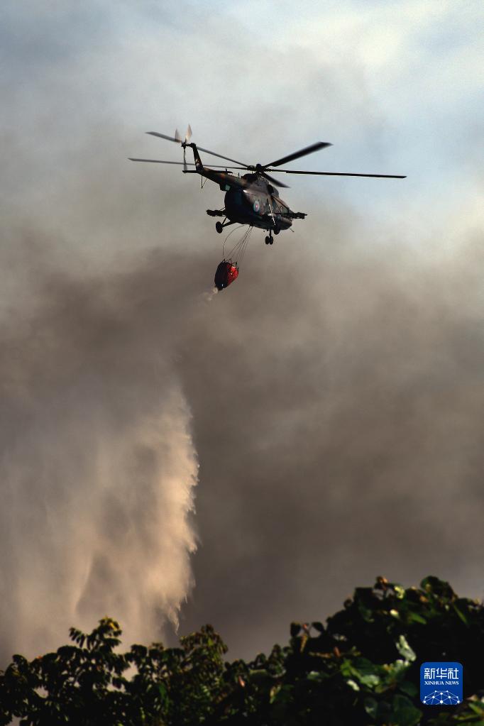 8月8日,在古巴馬坦薩斯省,消防直升機在火災現場作業。