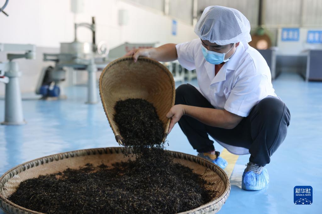 8月9日,工作人員在石阡縣楓香鄉梨子園村茶葉加工廠內對茶葉進行復烘。