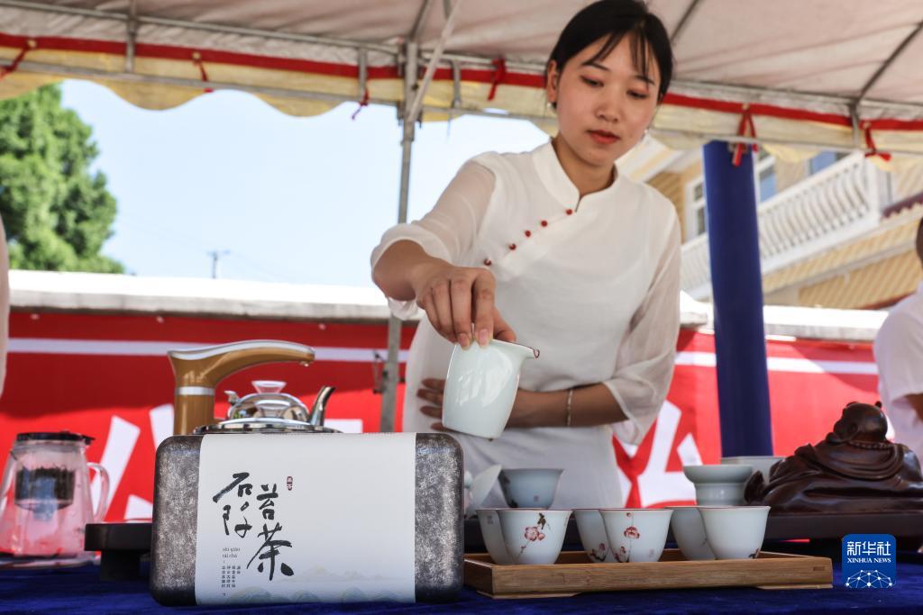 8月9日,工作人員在石阡縣楓香鄉梨子園村茶葉加工廠內沖泡茶葉。