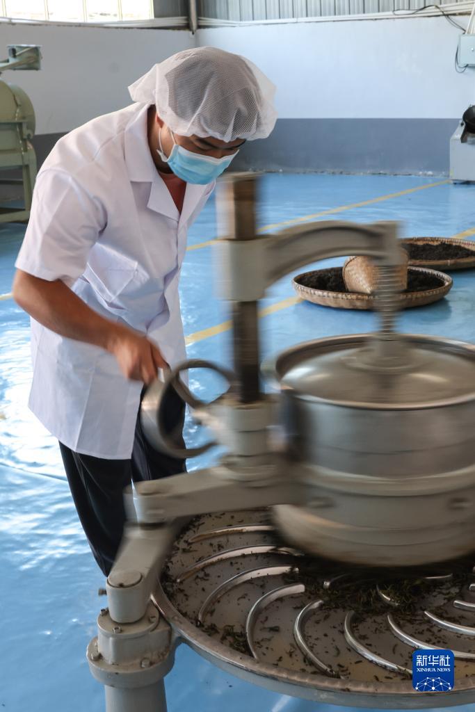8月9日,工作人員在石阡縣楓香鄉梨子園村茶葉加工廠內對茶青進行揉捻。