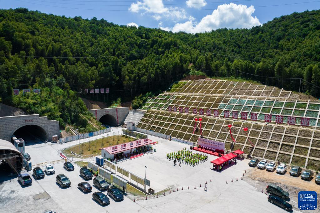 8月9日在衡永高速祁山隧道洞口拍攝的隧道貫通儀式(無人機照片)。