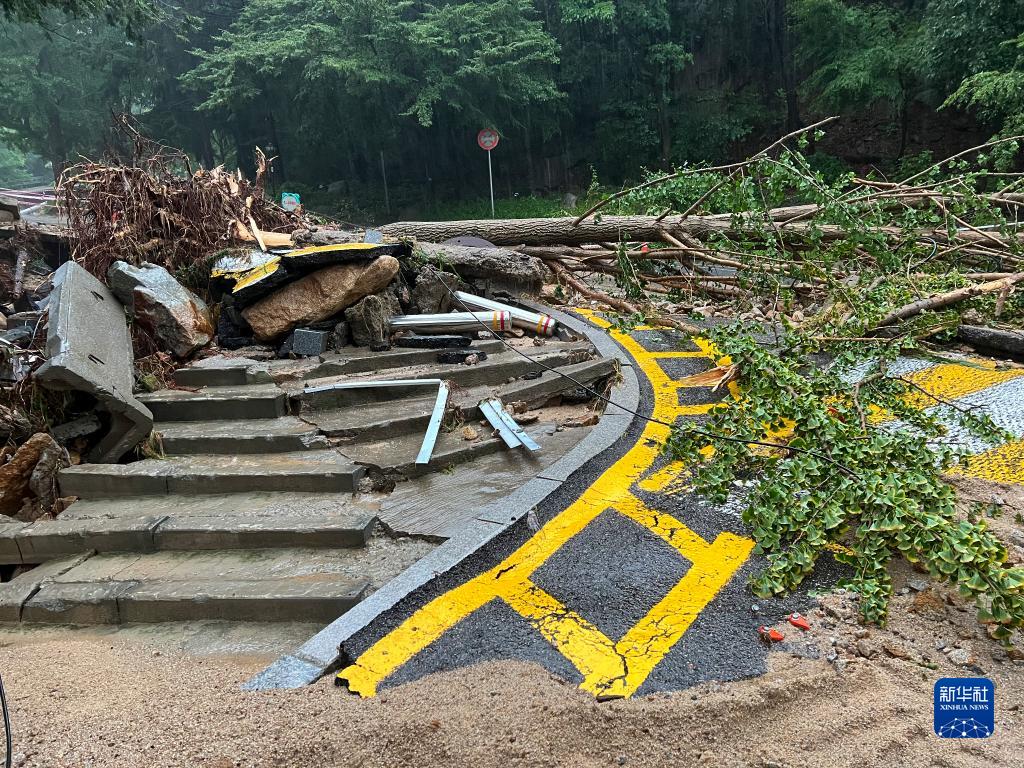 這是8月9日在韓國首爾大學拍攝的因遭遇強降雨而倒下的樹木和受損道路(手機拍攝)。