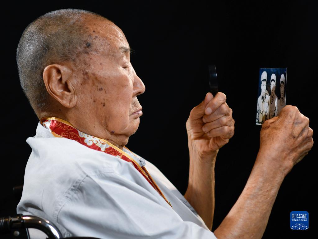 6月13日,在四川省南充市,抗戰老戰士王增印觀看年輕時與戰友們的合照。