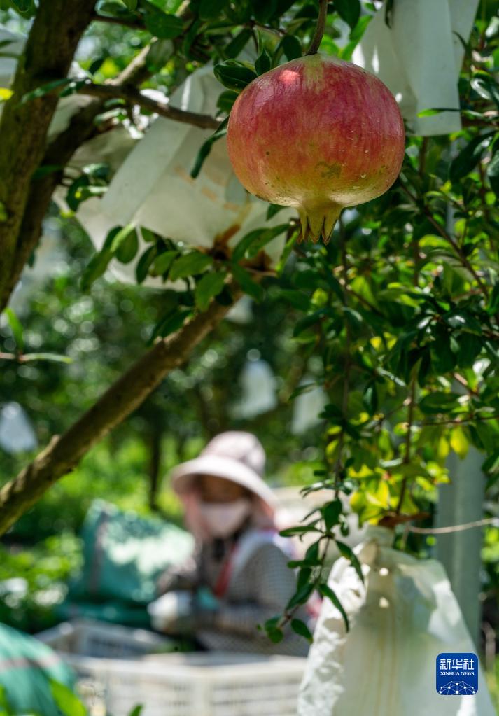 果農在云南蒙自市草壩鎮的五八農業軟籽石榴種植基地采摘石榴(8月9日攝)。