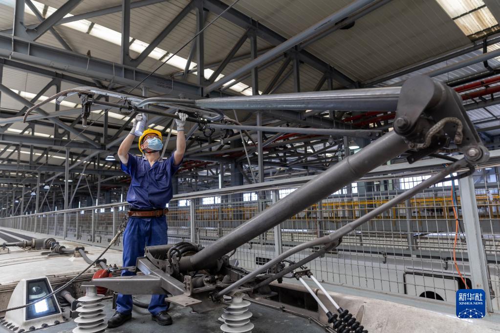 8月10日,動車組機械師袁洋對受電弓碳滑板進行漏風試驗。 新華社記者 王翔 攝