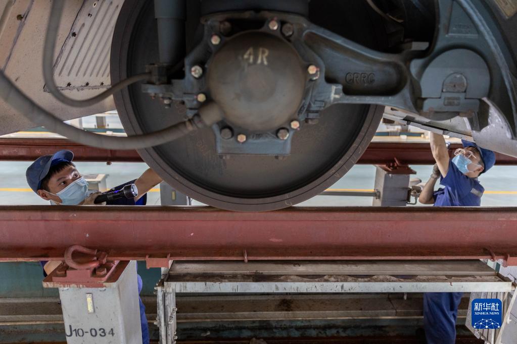 8月10日,動車組機械師對動車組進行檢查。 新華社記者 王翔 攝