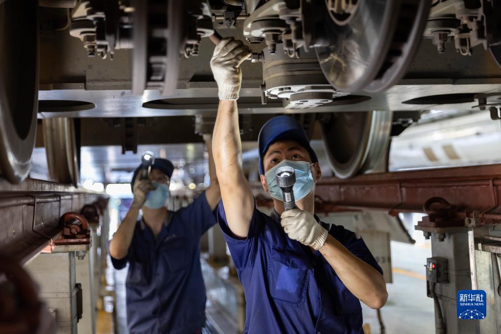 8月10日,動車組機械師對動車組轉向架進行檢查。 新華社記者 王翔 攝