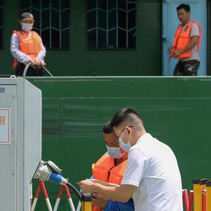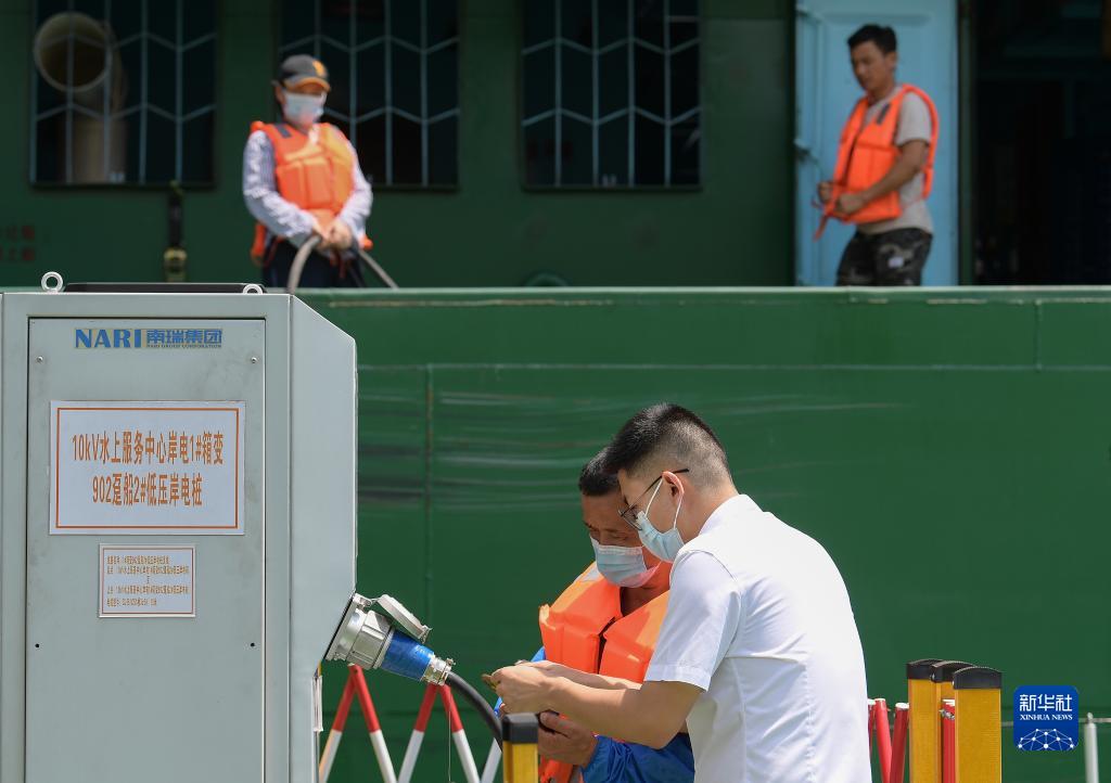 8月9日,長江三峽通航管理局工作人員為船員講解岸電充電樁的使用方法。