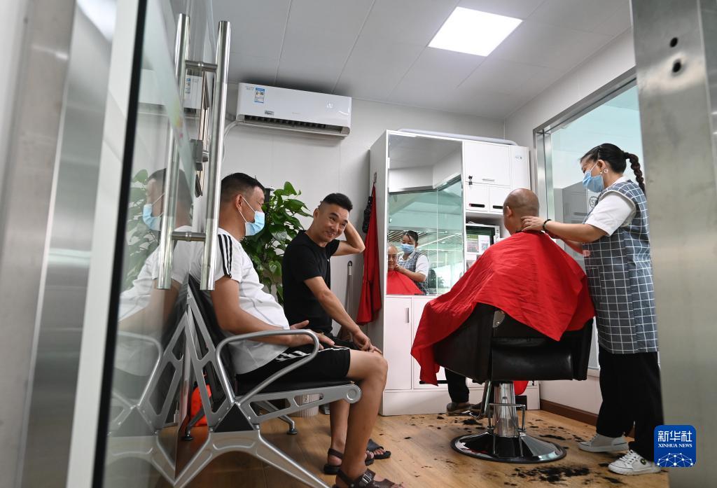 8月9日,船員在服務區的三峽水上溫情驛站的理發室內享受免費理發服務。 新華社記者 蔡湘鑫 攝