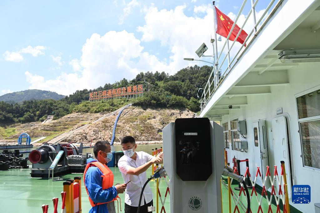 8月9日,長江三峽通航管理局工作人員為船員講解岸電充電樁的使用方法。 新華社記者 蔡湘鑫 攝