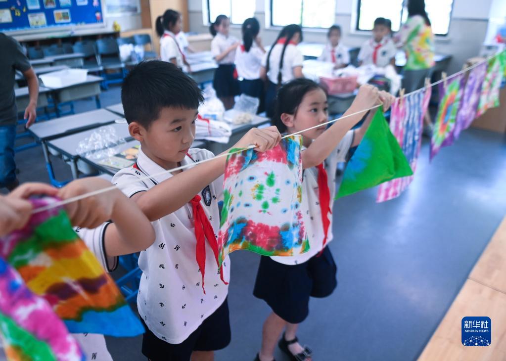 8月10日,湖州市吳興實驗小學的學生把做好的扎染作品掛在教室里。 新華社記者 徐昱 攝