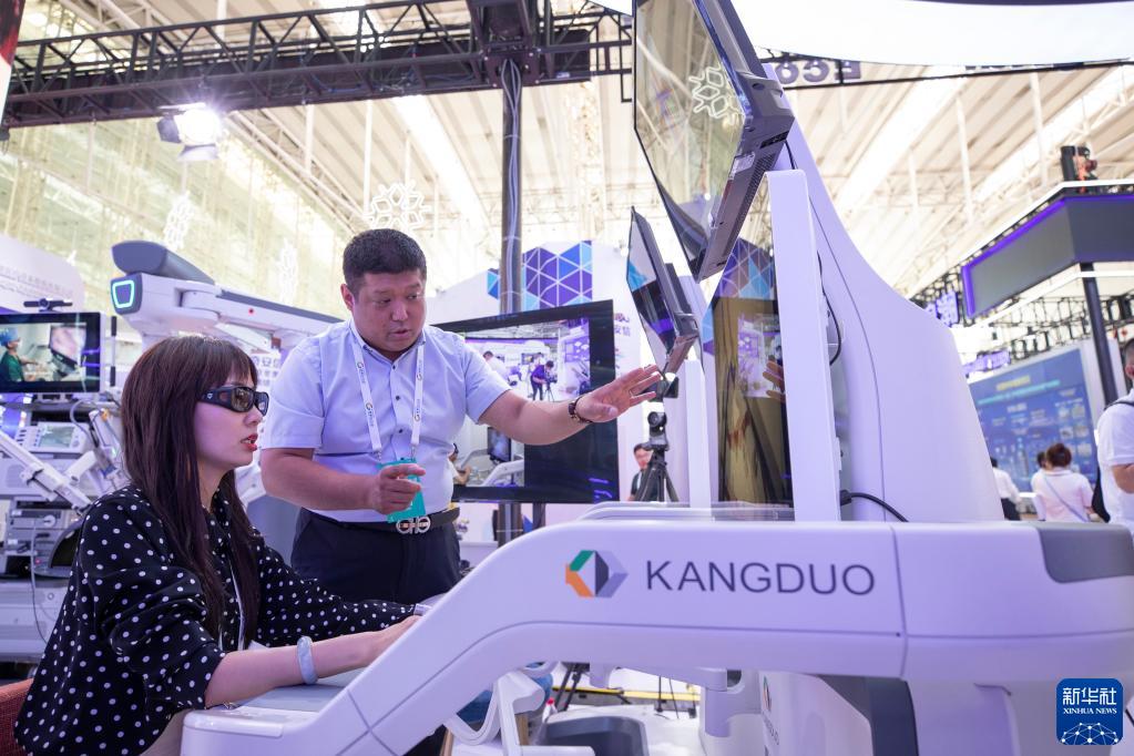 8月10日,在2022世界5G大會展廳里,參展商現場演示5G遠程手術機器人。
