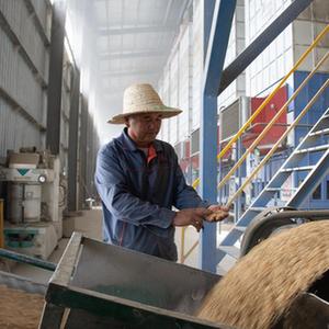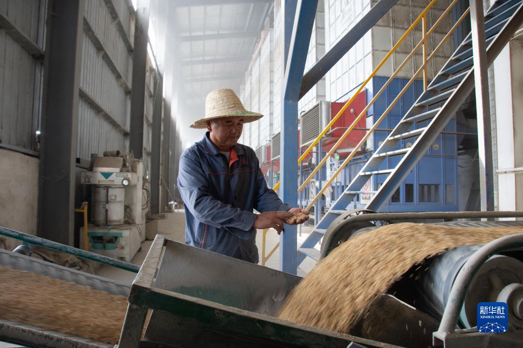 8月10日,在湖南省常德市漢壽縣毛家灘回族維吾爾族鄉牛路社區一糧食收購點烘干車間,工作人員檢查烘干后的稻谷。