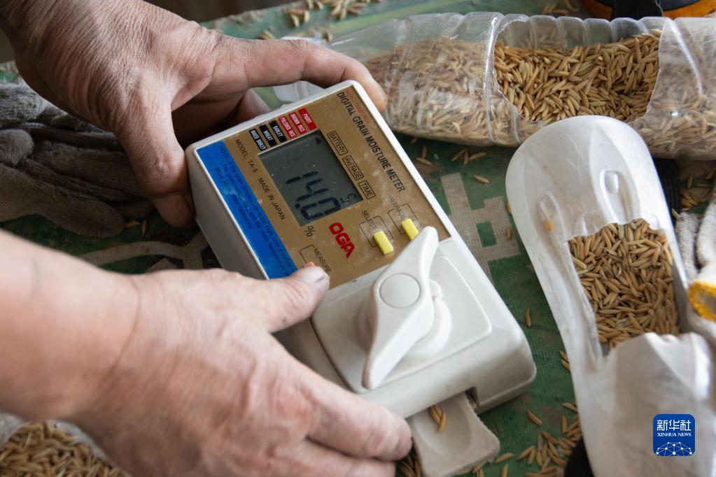 8月10日,在湖南省常德市漢壽縣毛家灘回族維吾爾族鄉牛路社區一糧食收購點,工作人員測量稻谷含水量。 新華社記者 柳王敏 攝