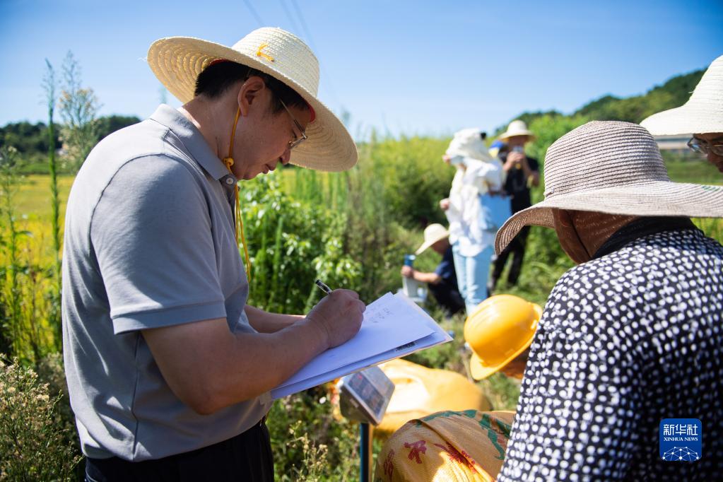 8月10日,在 “一季雜交稻+再生稻”生產模式寧鄉示范基地頭季稻測產驗收現場,工作人員記錄稻谷重量。