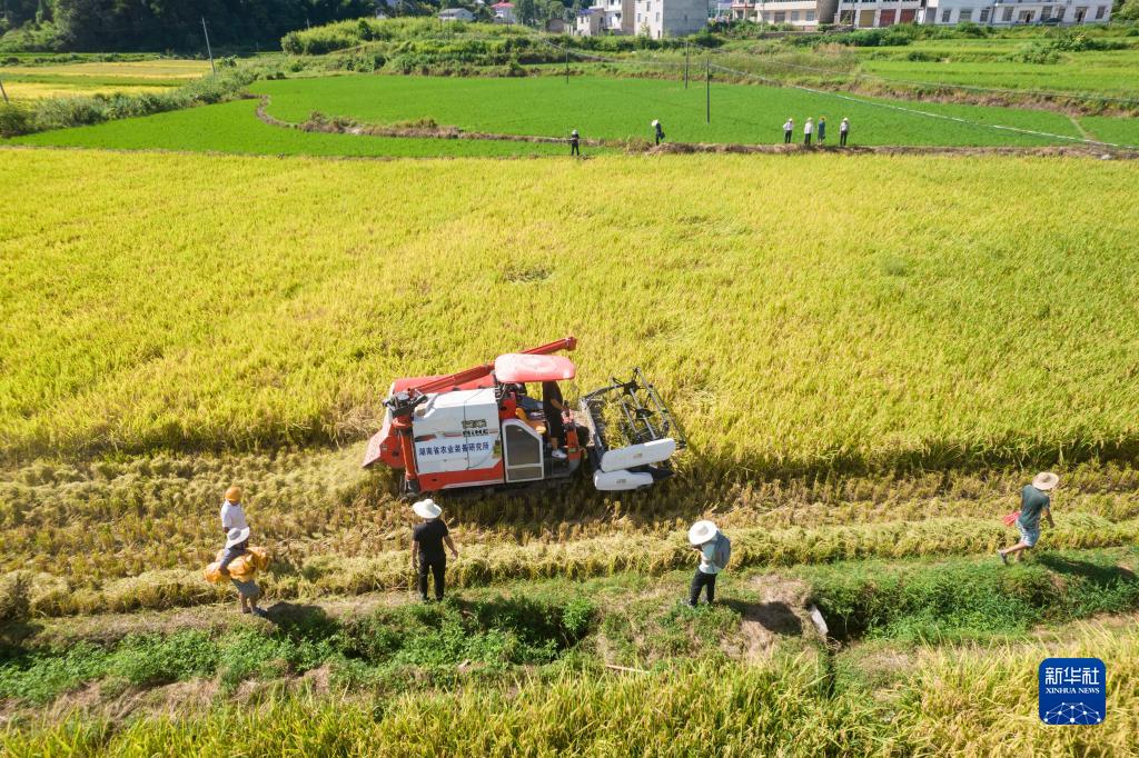 這是8月10日在湖南省長沙市寧鄉市流沙河鎮拍攝的“一季雜交稻+再生稻”生產模式寧鄉示范基地頭季稻測產驗收現場(無人機照片)。