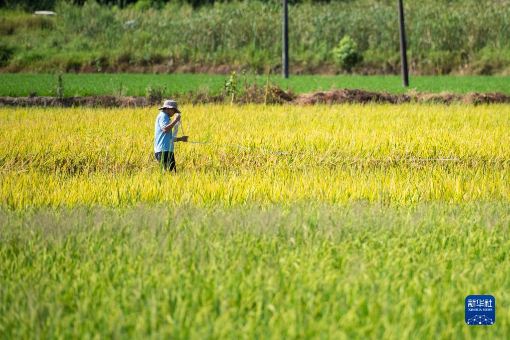 8月10日,在 “一季雜交稻+再生稻”生產模式寧鄉示范基地頭季稻測產驗收現場,工作人員測量試驗田面積。