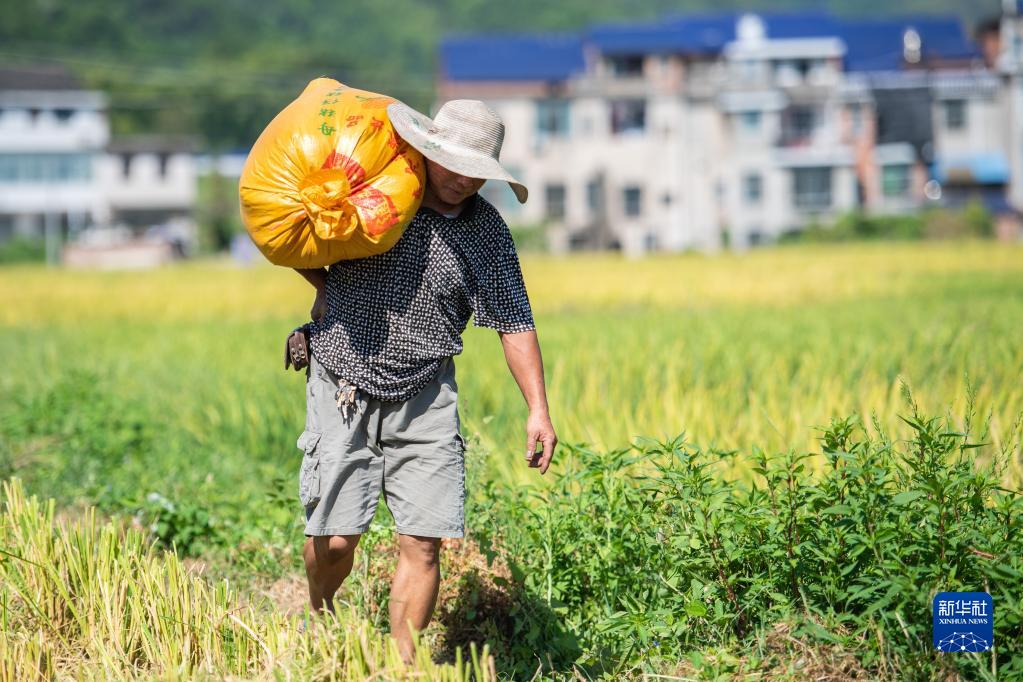 8月10日,在 “一季雜交稻+再生稻”生產模式寧鄉示范基地頭季稻測產驗收現場,工作人員搬運打包好的稻谷。