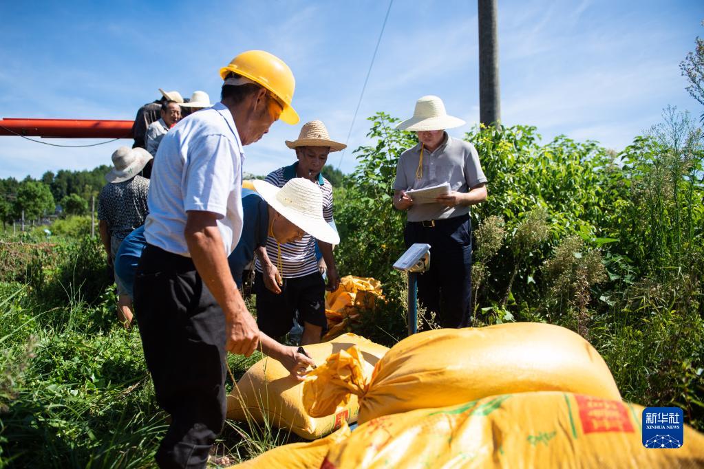 8月10日,在 “一季雜交稻+再生稻”生產模式寧鄉示范基地頭季稻測產驗收現場,工作人員為打包好的稻谷稱重。