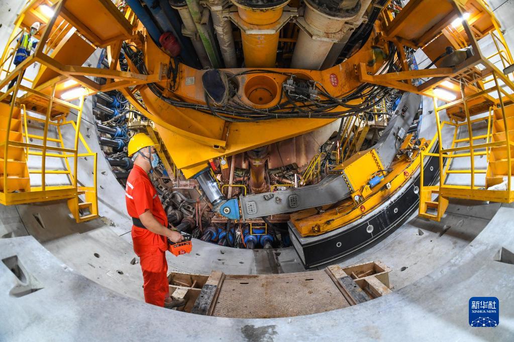 8月10日,施工人員在深江鐵路珠江口隧道操作機械臂安裝管片。 新華社記者 劉大偉 攝