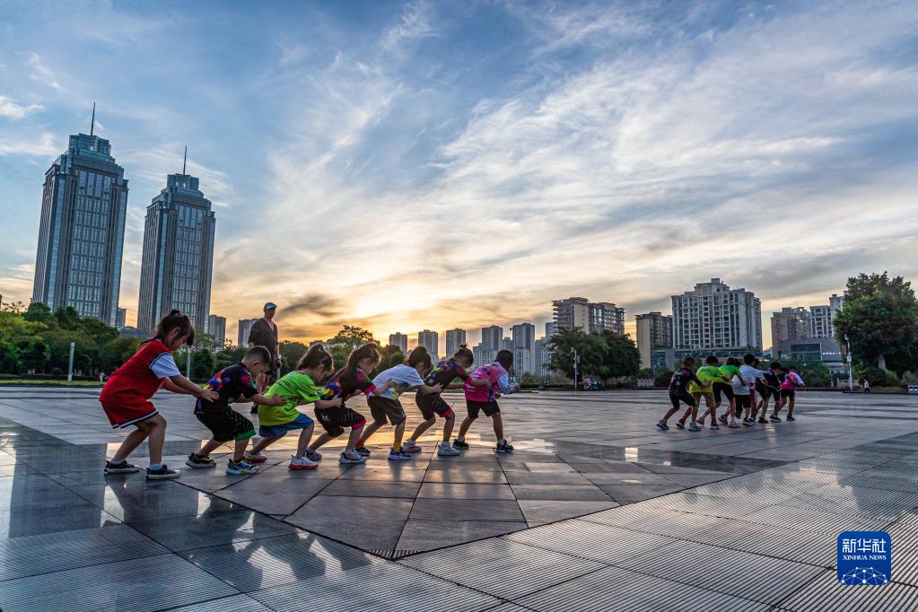 8月10日,小朋友在重慶市南川區市民廣場學習輪滑基本動作。