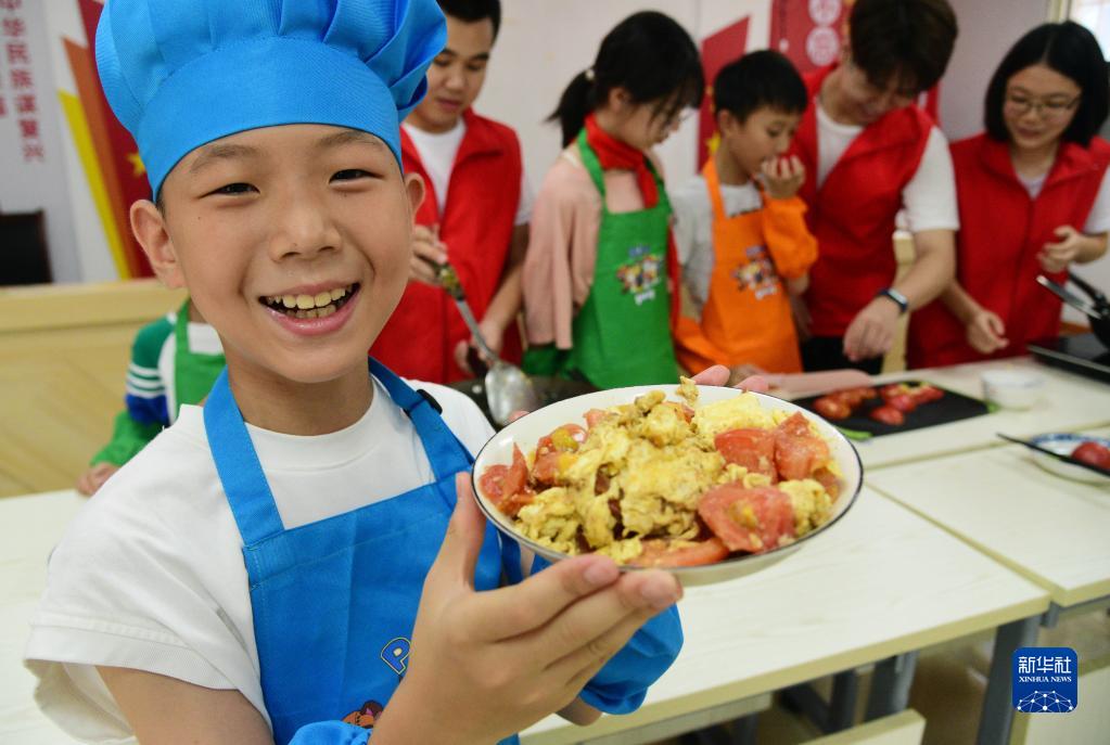 8月10日,在江蘇省鎮江市紅光太古山社區,一名小朋友展示江蘇大學志愿者指導他烹制的家常菜。