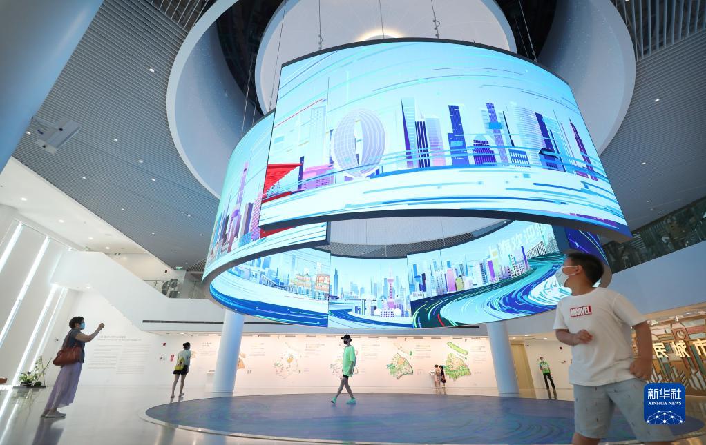 8月11日,參觀者觀看上海城市規劃展示館的“上海印象”城市畫卷環形巨幕。