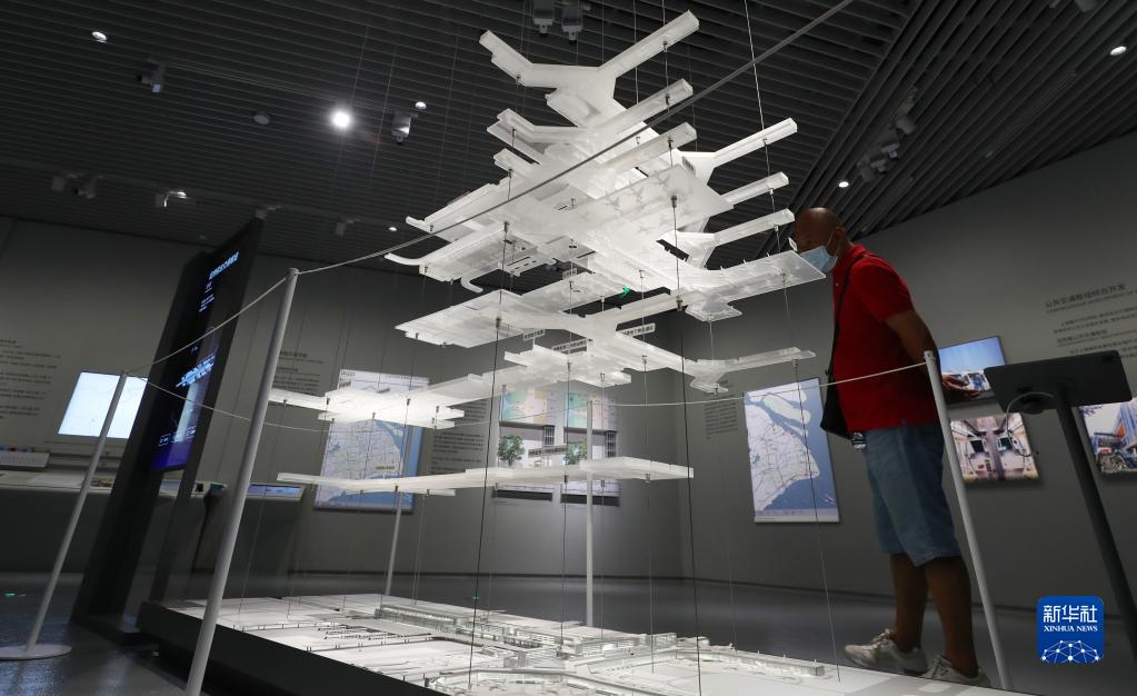 8月11日,一位參觀者在上海城市規劃展示館觀看上海虹橋機場結構模型。