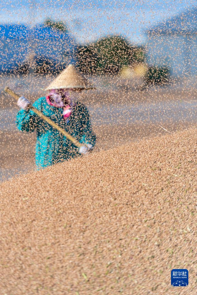 8月10日,在北大荒集團紅星農場有限公司一曬場,職工在揚場。