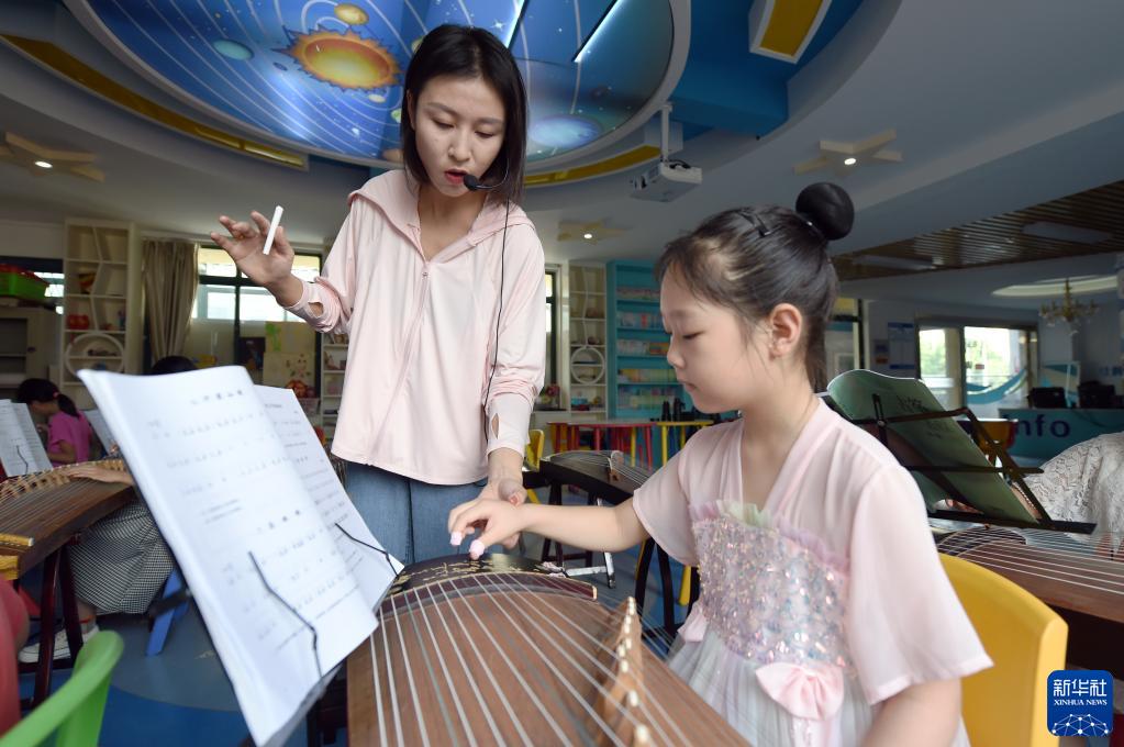 8月10日,在合肥市鳳凰城小學暑期托管班里,學生在老師指導下學習古箏。