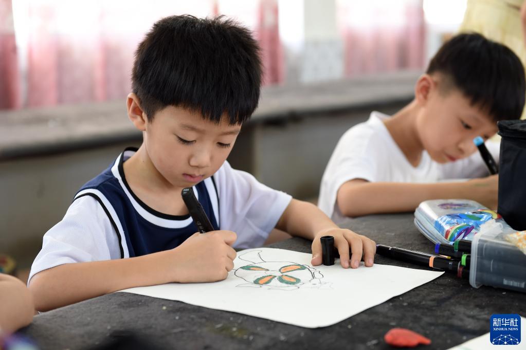 8月11日,合肥市蜀新苑小學的學生在暑期托管班里學習繪畫。