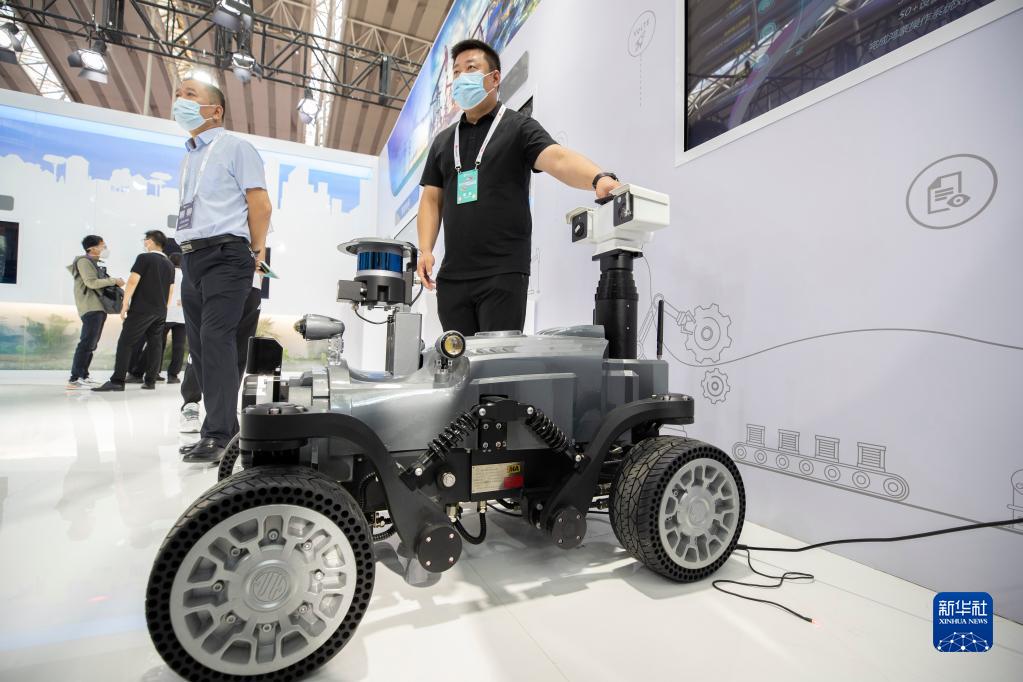 8月11日,在2022世界5G大會展廳里,參展商介紹5G網絡支持下的礦上巡檢機器人。