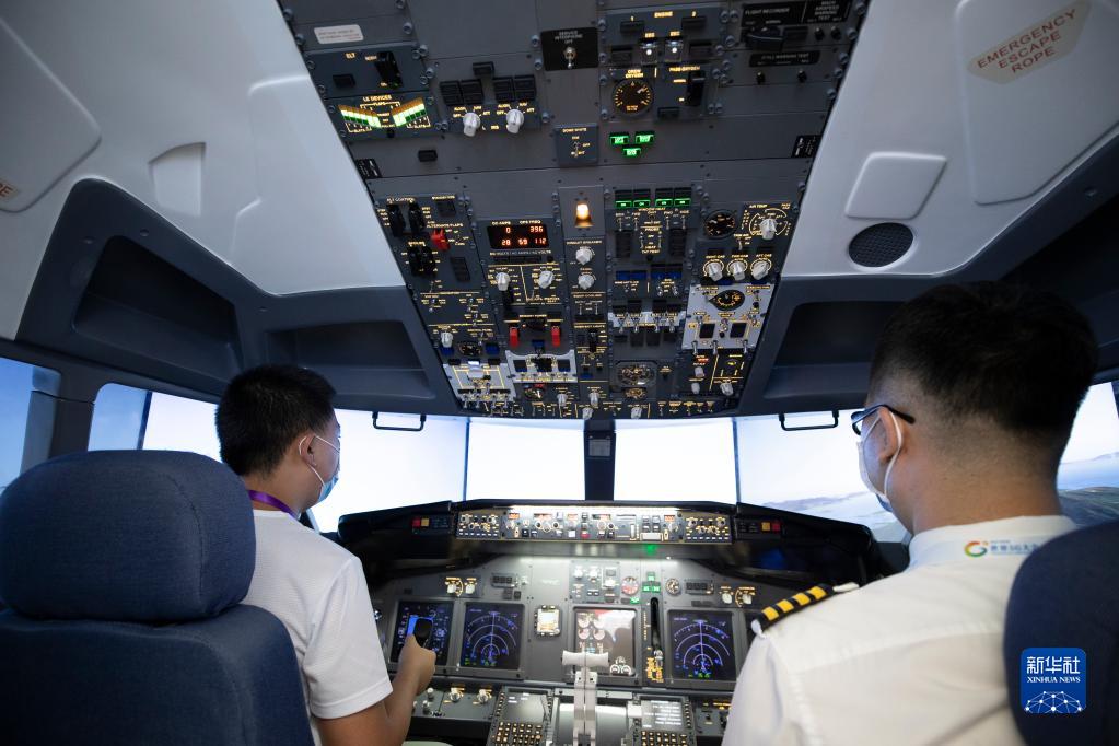 8月11日,在2022世界5G大會展廳里,參觀者體驗5G網絡支持下的模擬飛行艙。