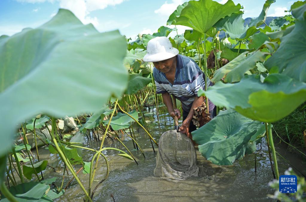 江西省廣昌縣塘坊鎮村里村村民在蓮塘里捕撈養殖的活魚(8月10日攝)。