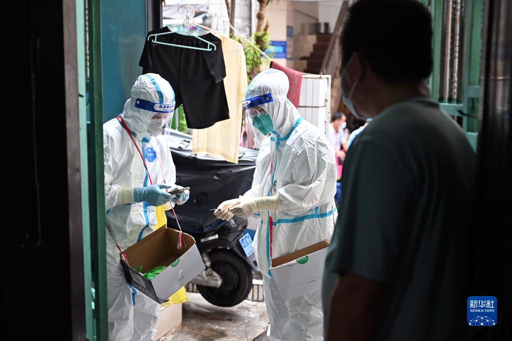 8月11日,河南省援海南三亞醫療隊的醫護人員李娟(左二)在三亞市天涯區南邊海漁村進行入戶核酸采樣。