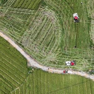 8月11日,農技人員在貴州省黔東南苗族侗族自治州岑鞏縣注溪鎮周坪村雜交水稻制種基地采收種稻(無人機照片)。