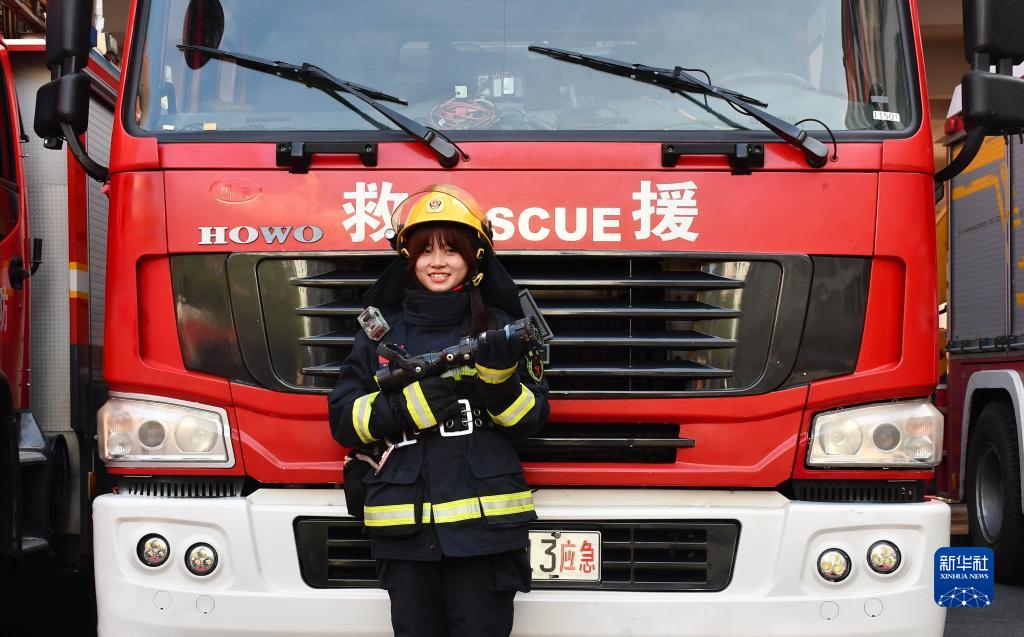 陶佳煜穿上消防服在萍鄉市消防救援支隊的消防車前留影(7月11日攝)。