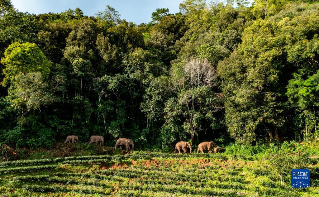 象群途經云南省普洱市江城哈尼族彝族自治縣一村莊(無人機照片,8月1日攝)。新華社記者 江文耀 攝