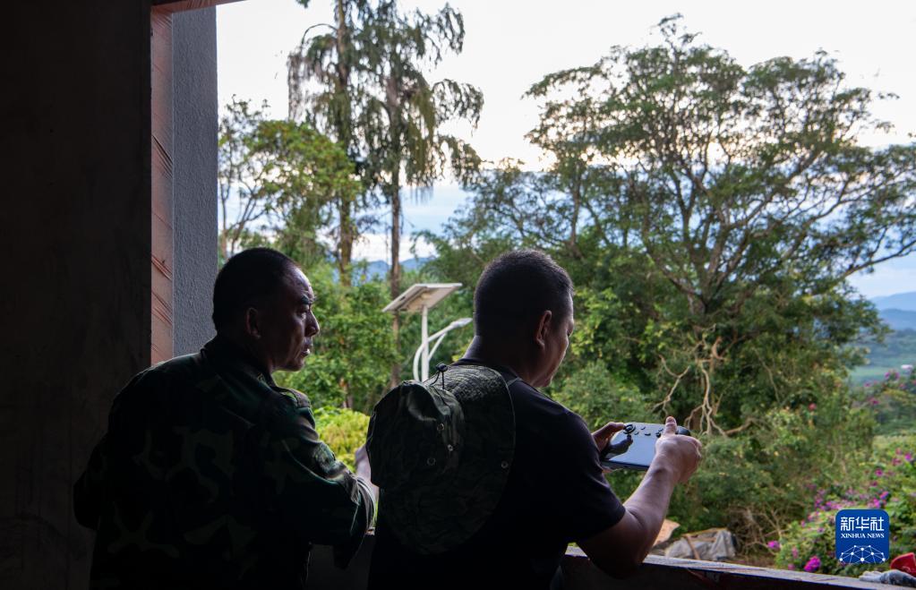 刁發興(右)和同事一起借助無人機監測象群動向(8月1日攝)。新華社記者 江文耀 攝