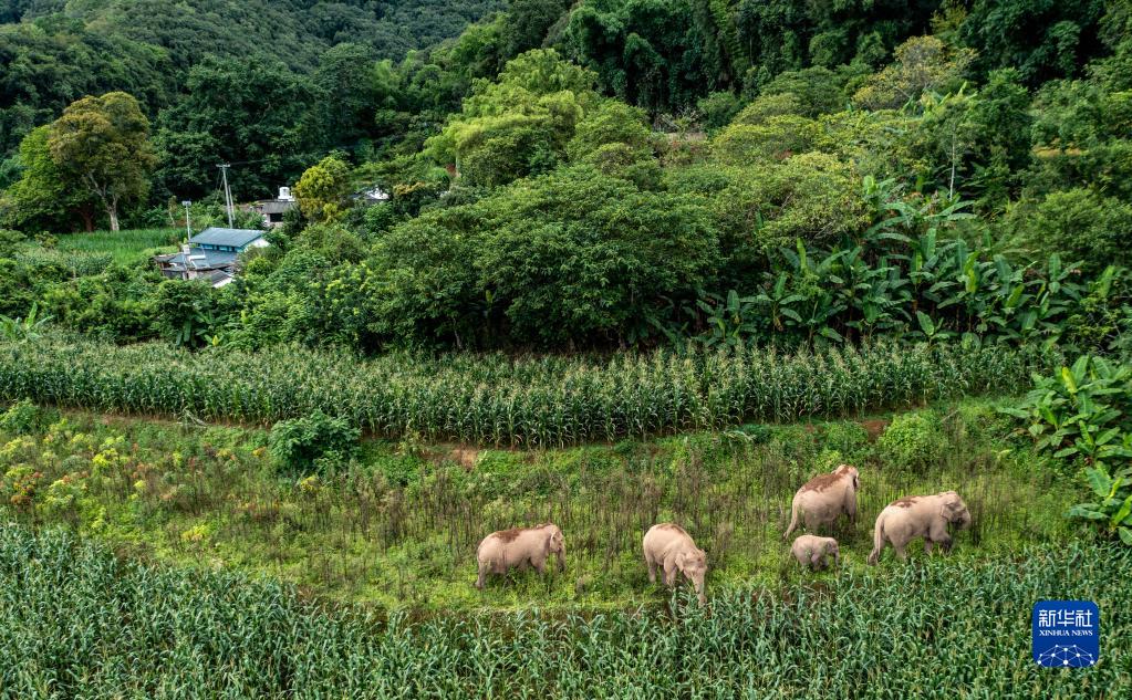 象群途經云南省普洱市江城哈尼族彝族自治縣一村莊(無人機照片,8月1日攝)。新華社記者 江文耀 攝
