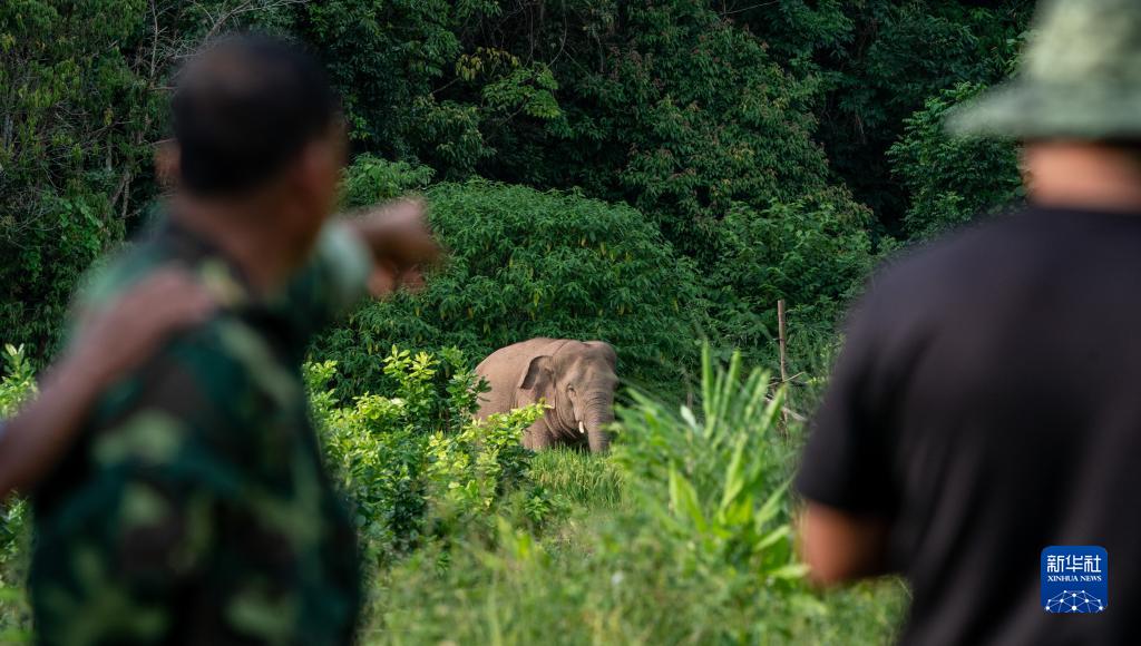 刁發興(右)在觀察村莊附近的野象(8月1日攝)。新華社記者 江文耀 攝
