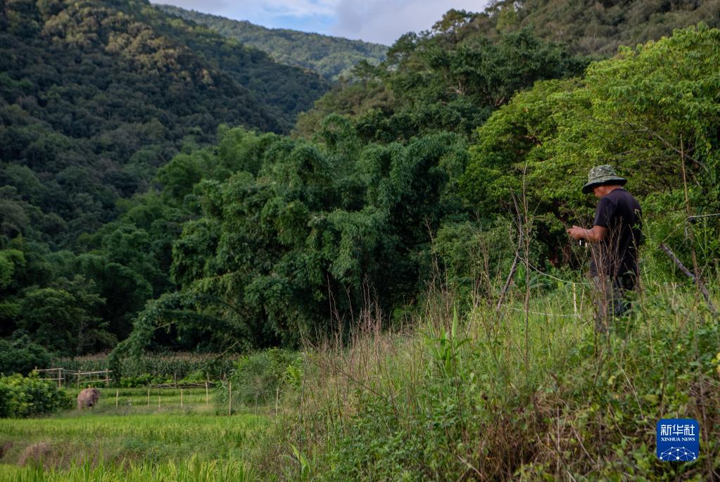 刁發興使用無人機監測象群,不遠處一頭亞洲象正在覓食(8月1日攝)。新華社記者 江文耀 攝