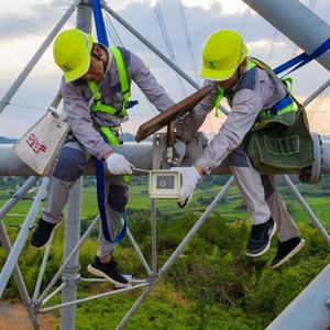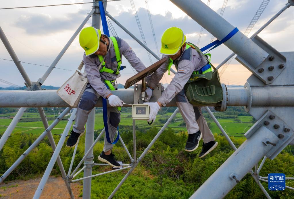 8月11日,安徽送變電工程有限公司廣德運檢站運維人員在維護可視化在線監控設備(無人機照片)。