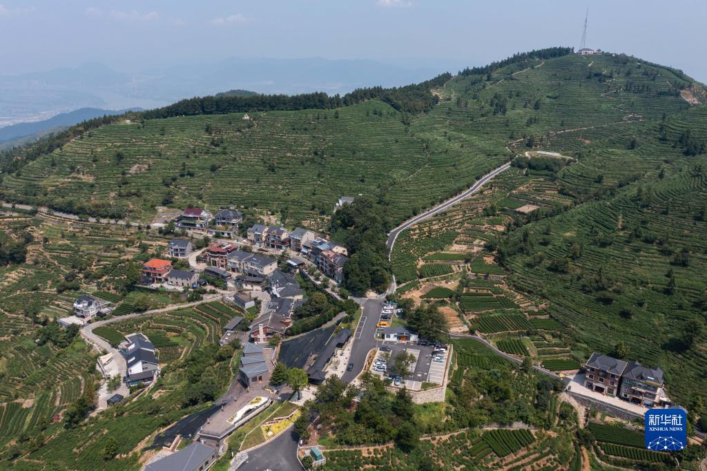 8月12日,空中俯瞰富陽區里山鎮安頂村(無人機照片)。從2022年初開始,安頂村在完成安頂云霧茶核心區塊116戶350畝茶地流轉,推進茶產業升級的同時,吸引新鄉賢回歸,利用自然風光、閑置房屋打造“星空露營”“云霧茶吧”“天空之鏡”等景點,帶動鄉村百姓就業增收。